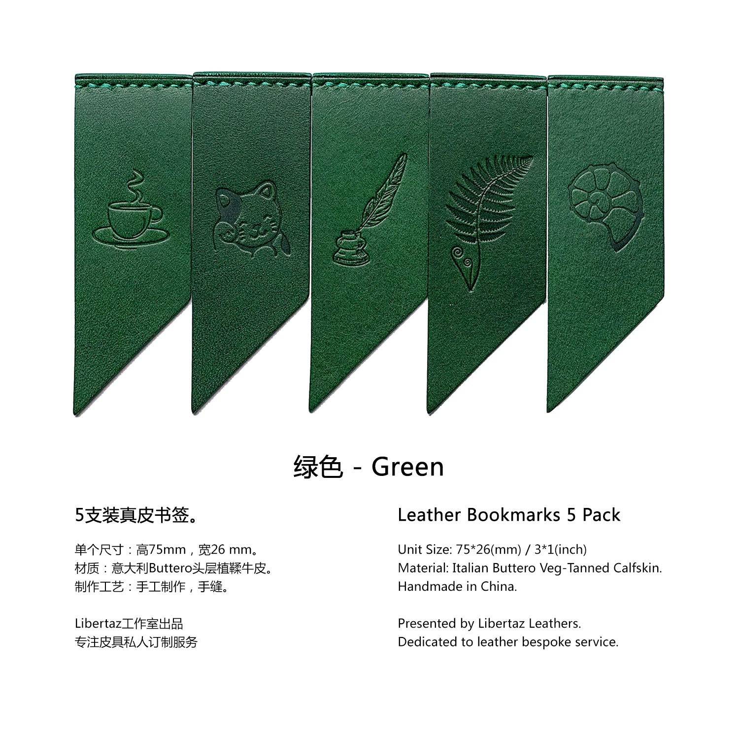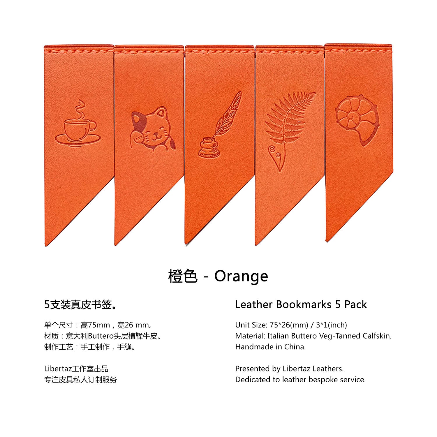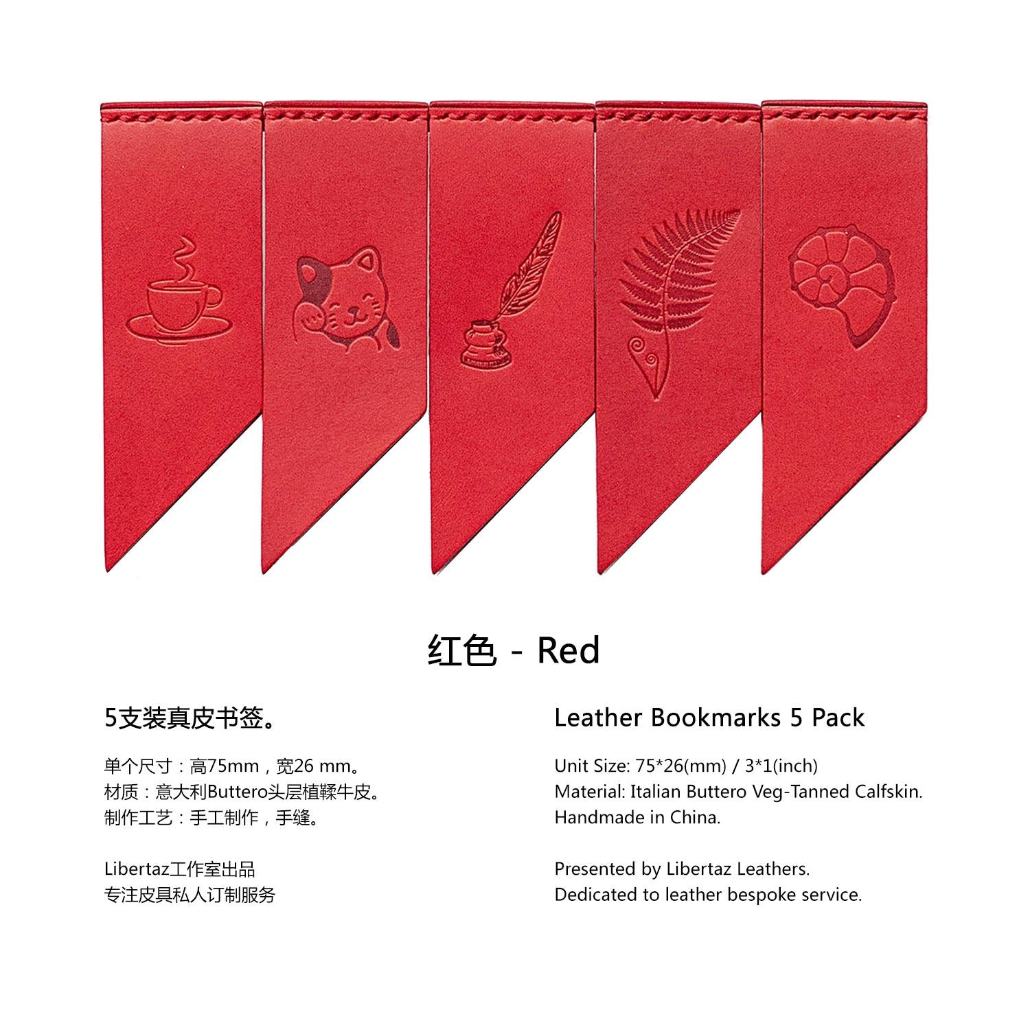 Add some colors to your reading! Libertaz leather bookmarks are hand-crafted with the famous vegetable-tanned leather Buttero from Italy. Featuring a double flap, the bookmark will keep in position firmly. Pack of 5, each one has a different but equally beautiful stamping. Perfect gift for book lovers and journal enthusiasts!