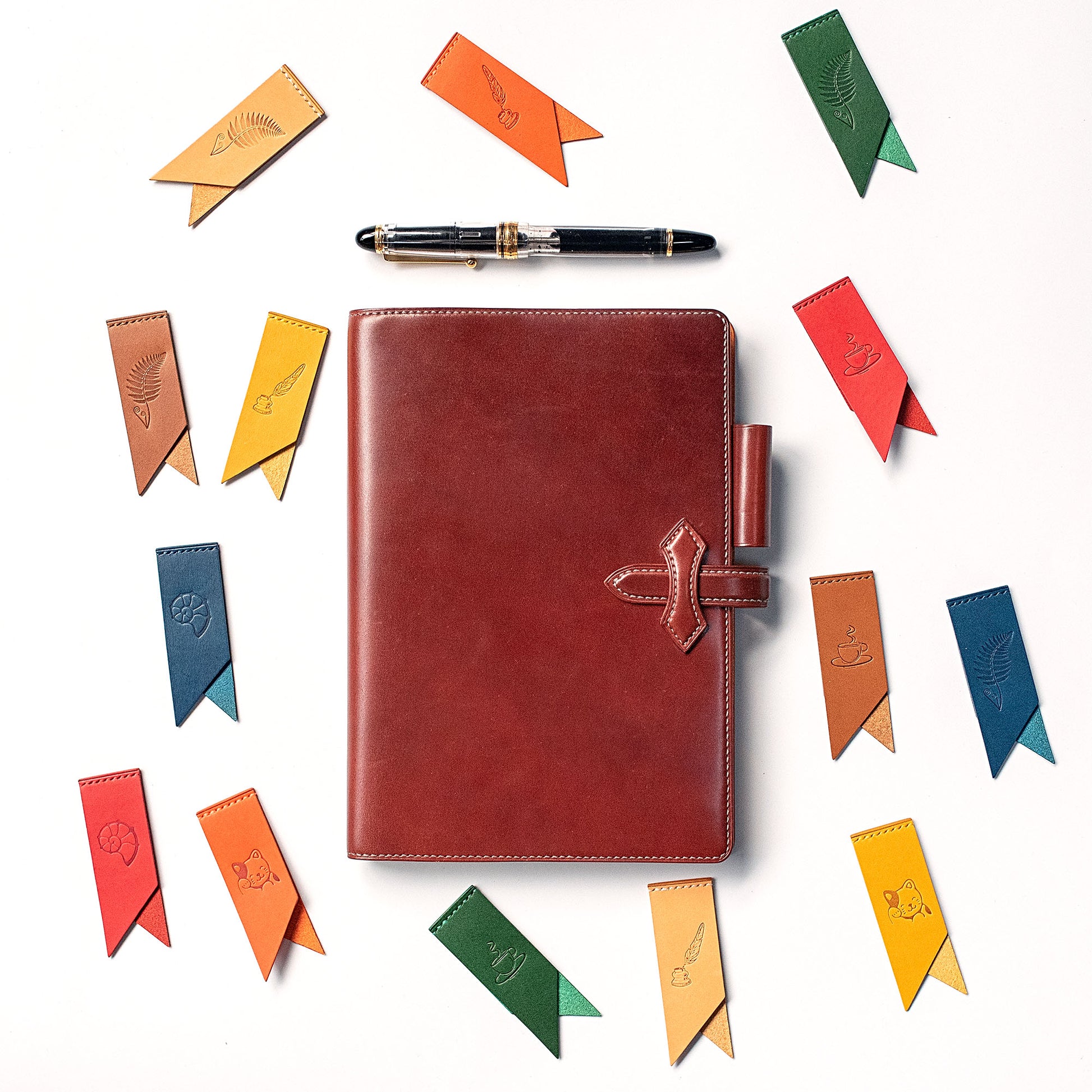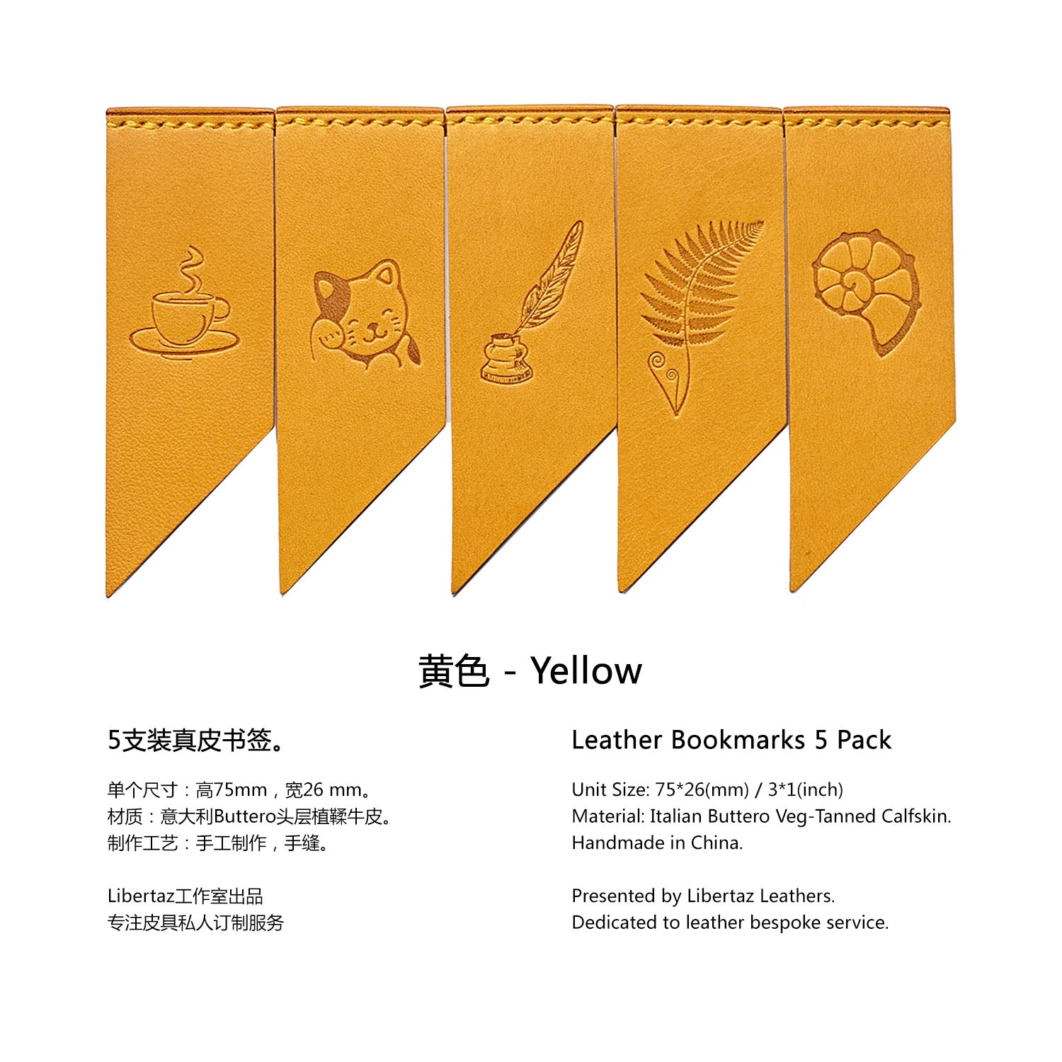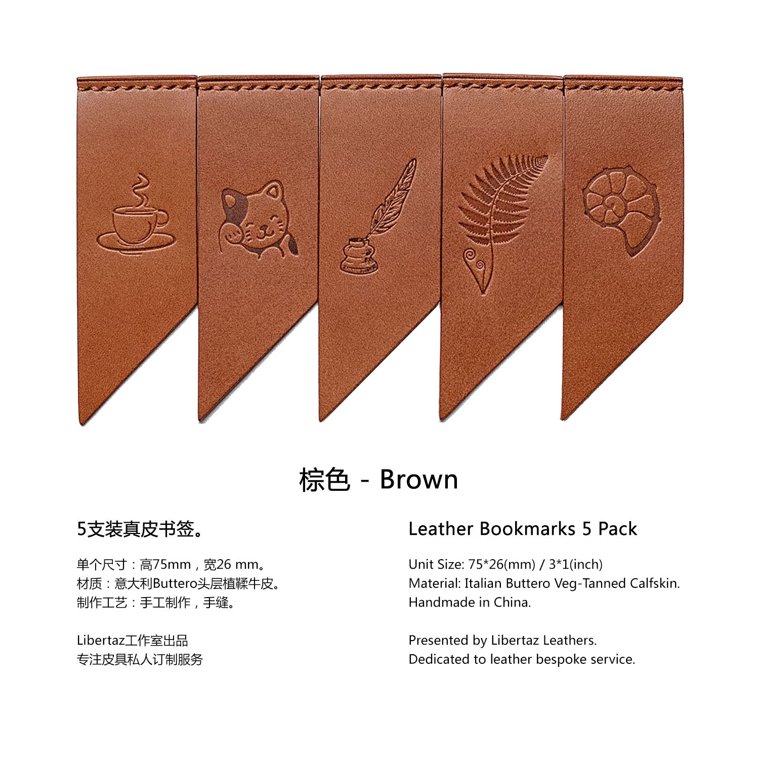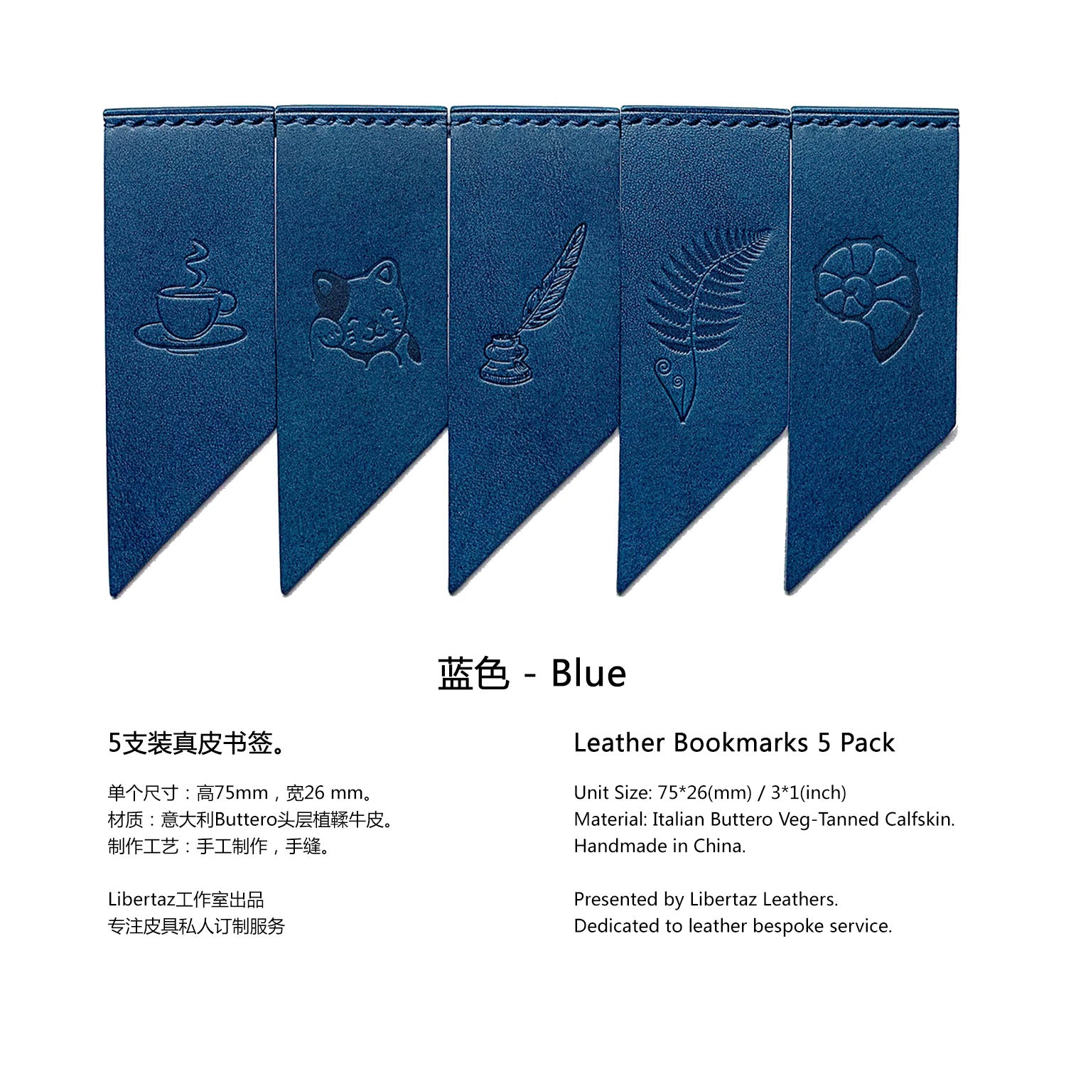 Add some colors to your reading! Libertaz leather bookmarks are hand-crafted with the famous vegetable-tanned leather Buttero from Italy. Featuring a double flap, the bookmark will keep in position firmly. Pack of 5, each one has a different but equally beautiful stamping. Perfect gift for book lovers and journal enthusiasts!
