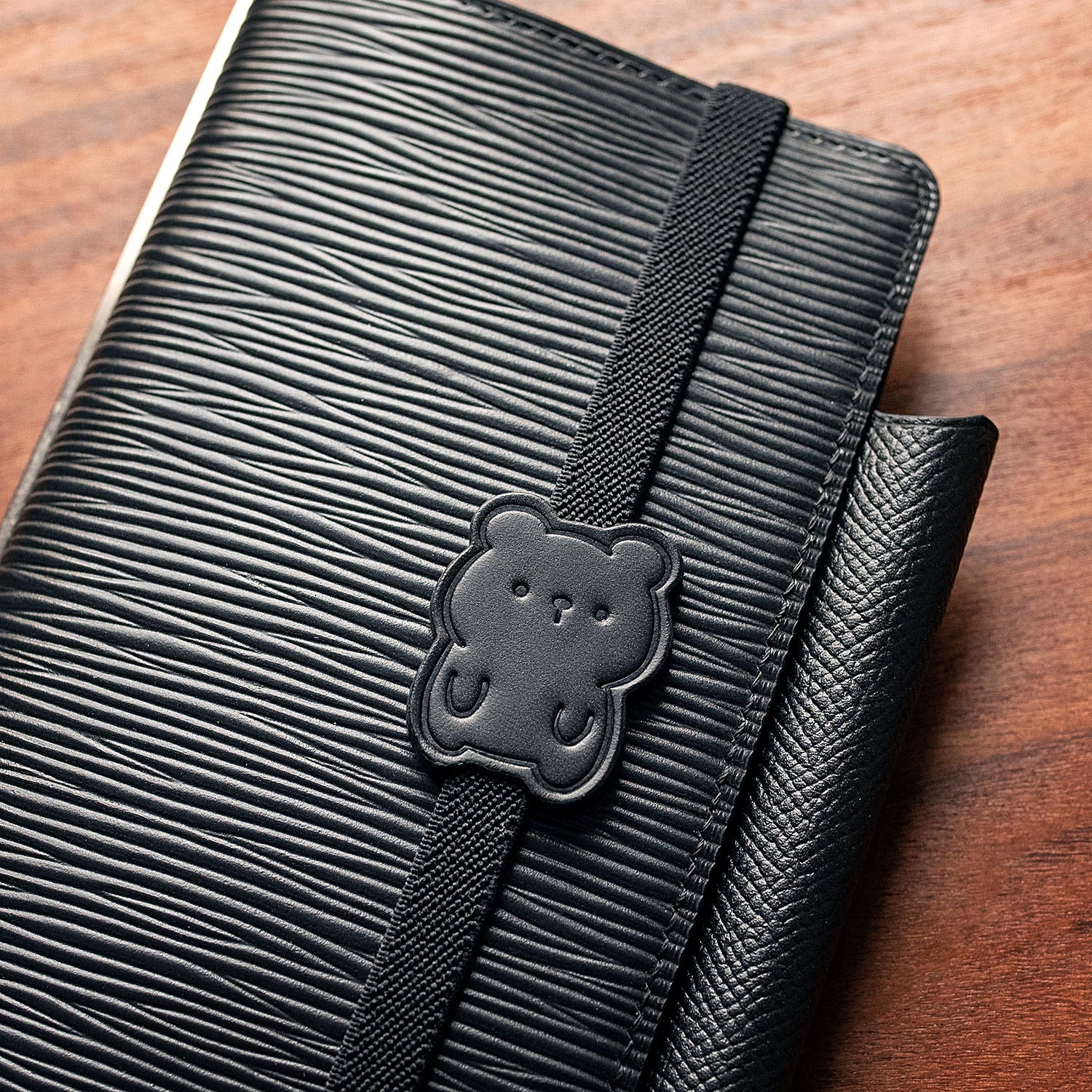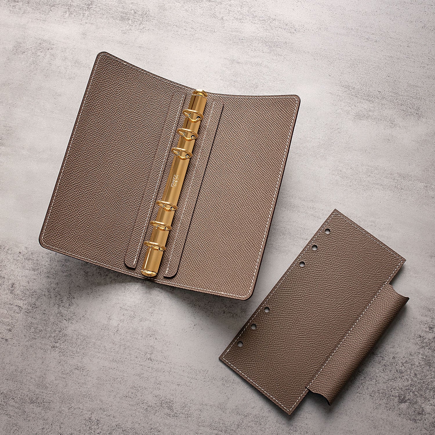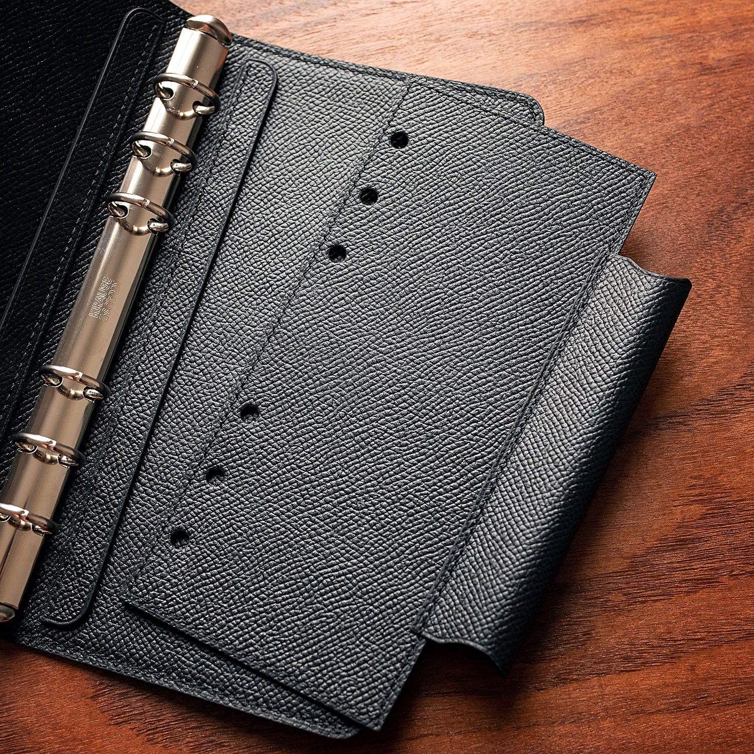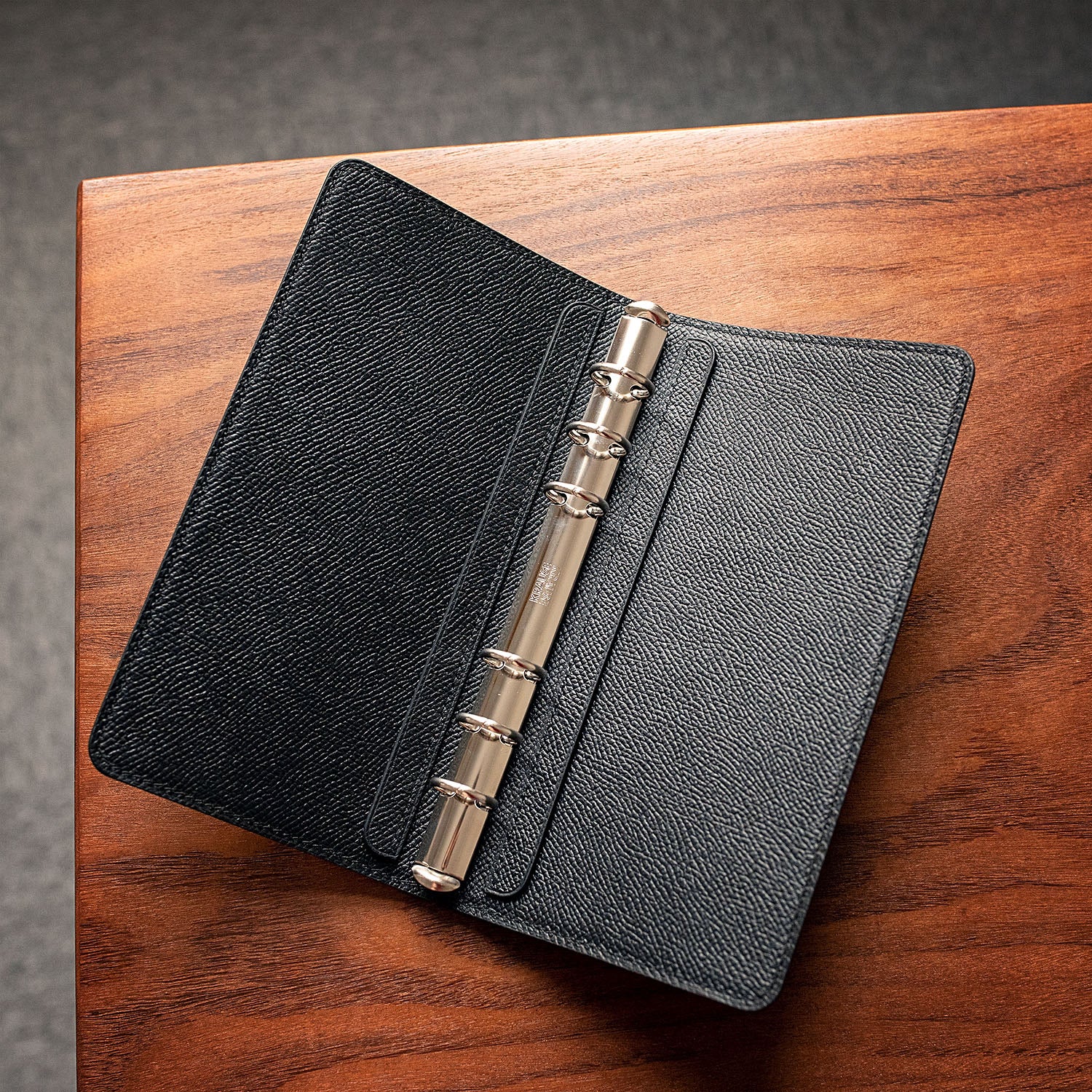 Narrow size ring planner with a lifter penholder in black Epsom.